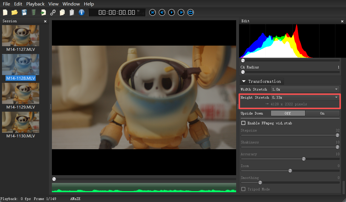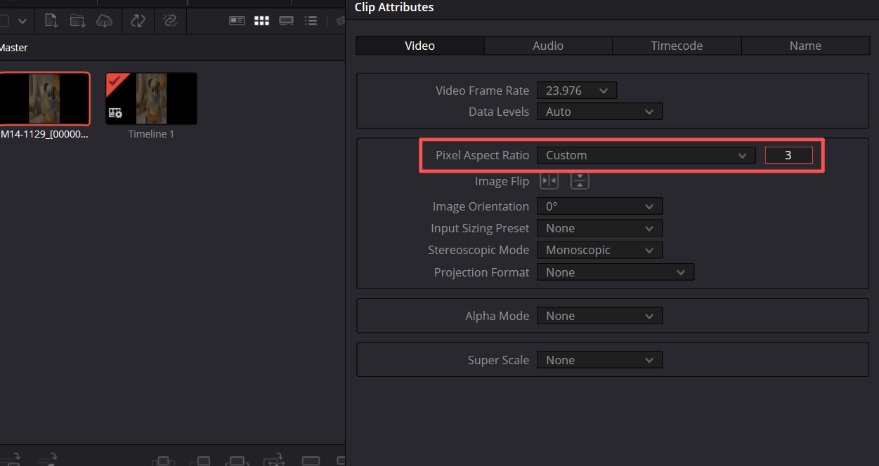 For example, here the Height Stretch is 0.33x, which means it is stretched 3 times in width. So in DaVinci Resolve, you need to select "CUSTOM" for the Pixel Aspect Ratio in the clip attributes, and then fill in "3" in the following box. After that, check the "disable_stretch" function of the plugin.